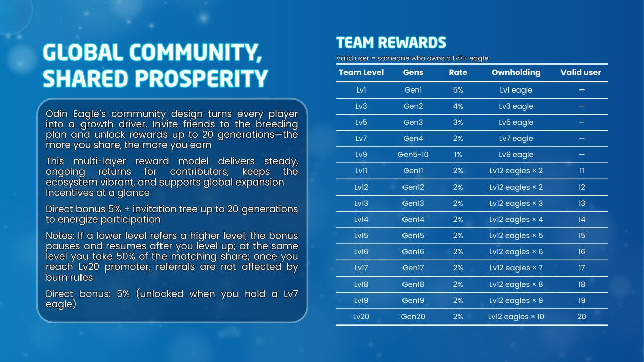(No reward for small referrals, but will recover after upgrading. Players at the same level receive 50% of their rewards. At level 20, referrals are not affected by burns at any level.) Direct Referral Bonus: 5% (Activates when you raise your own Level 7 Eagle)